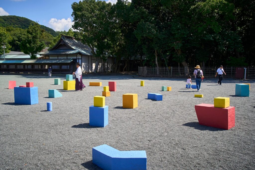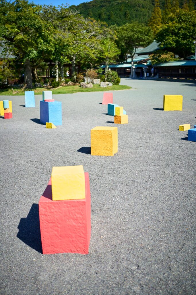 祈願殿の前に置かれたカラフルなセラミックのブロックたち。